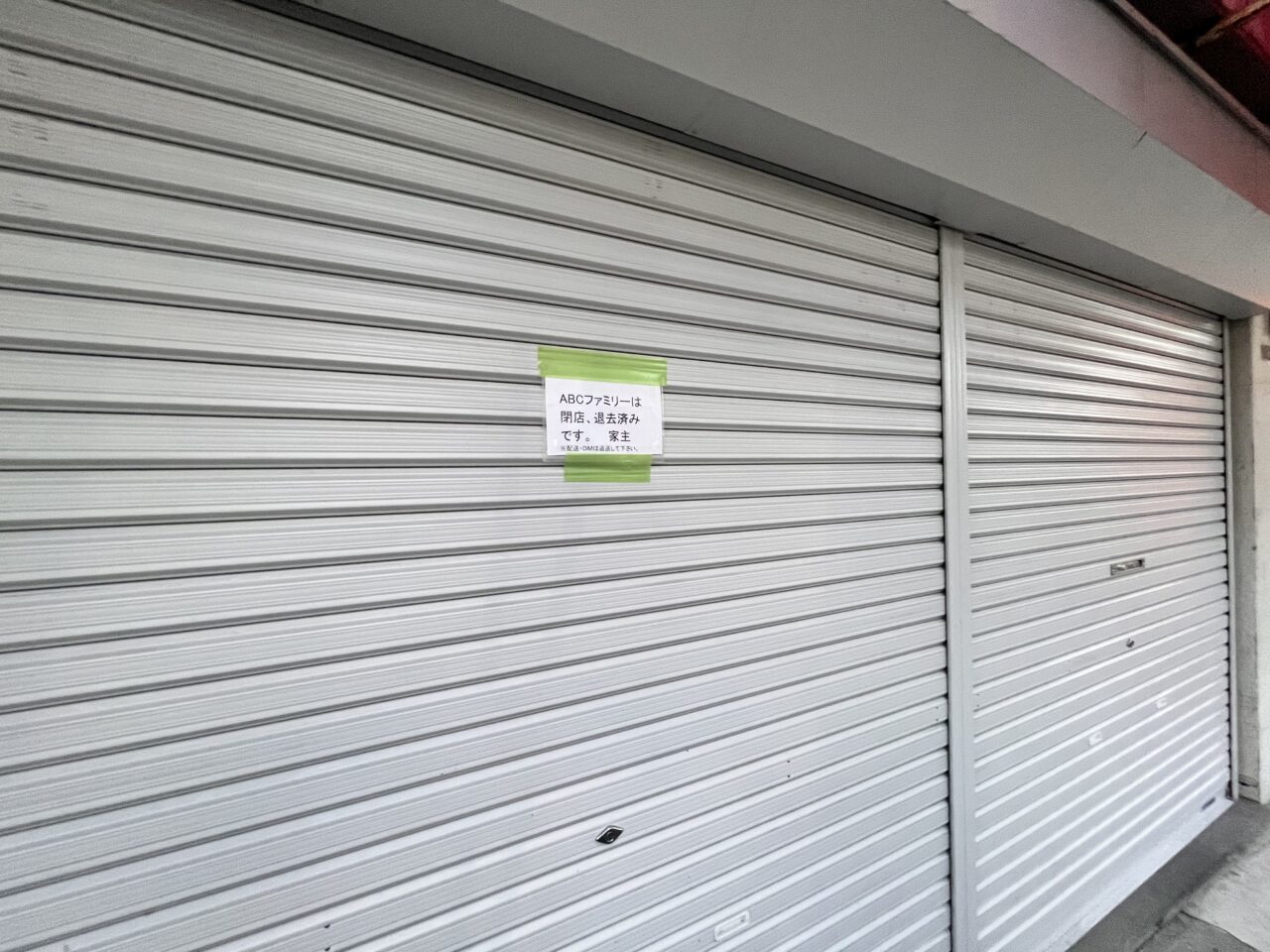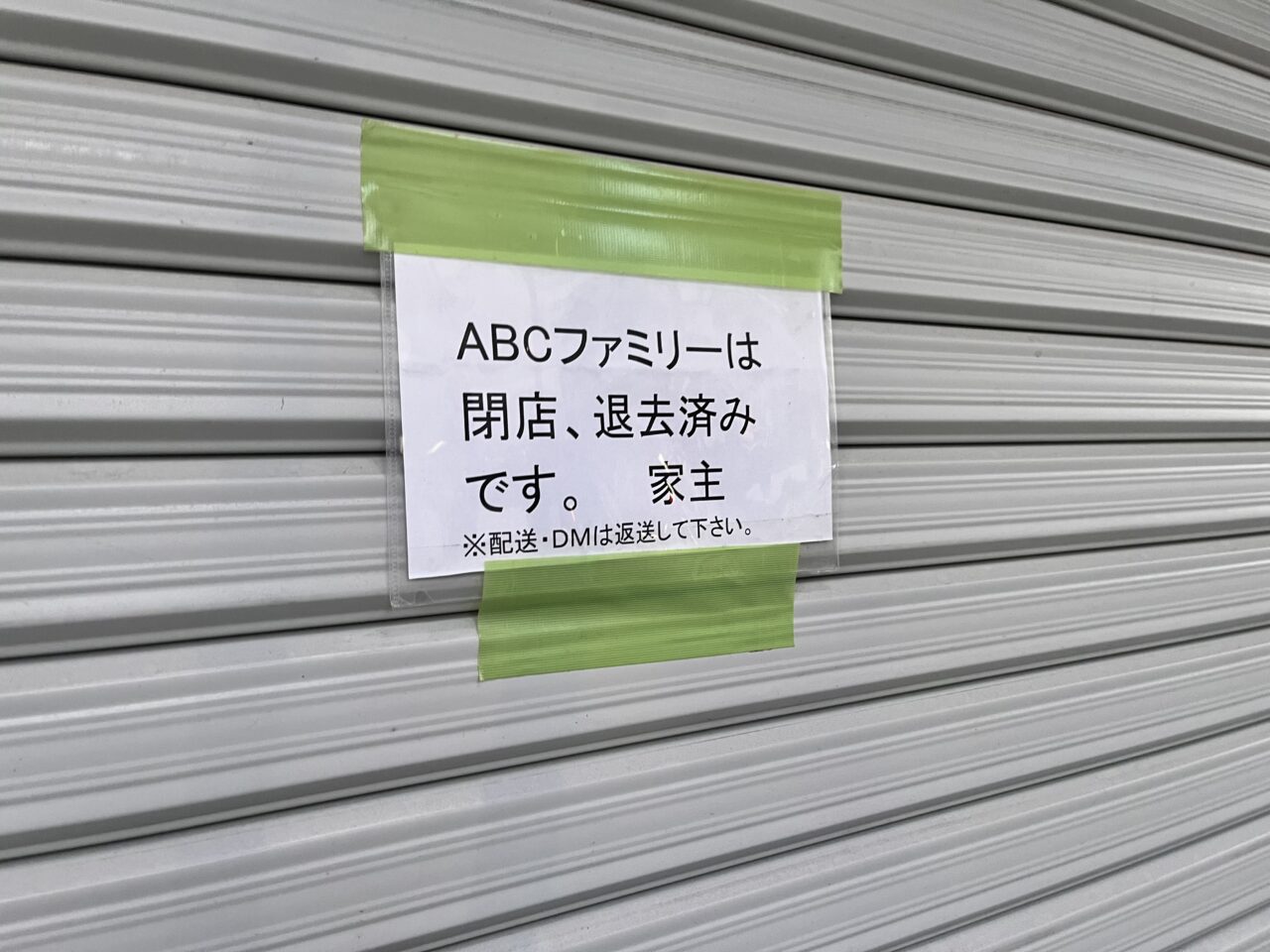 「ABCファミリーは閉店、退去済みです。 家主」とのお知らせが掲示されていました。