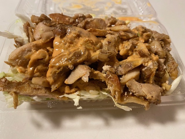 オリジナルのローストチキンケバブ!ふわふわのキャベツ・オリジナルソース、仕上げにサルサソース・オニオンフライをトッピング