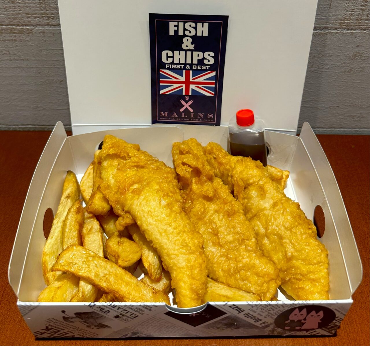 厳選した素材と英国の調理メソッドの融合。ボックスインのフードトラック用特別メニューでご案内!外はサクサク、中はジューシー、ライトな食感が魅力のフィッシュ&チップスです。