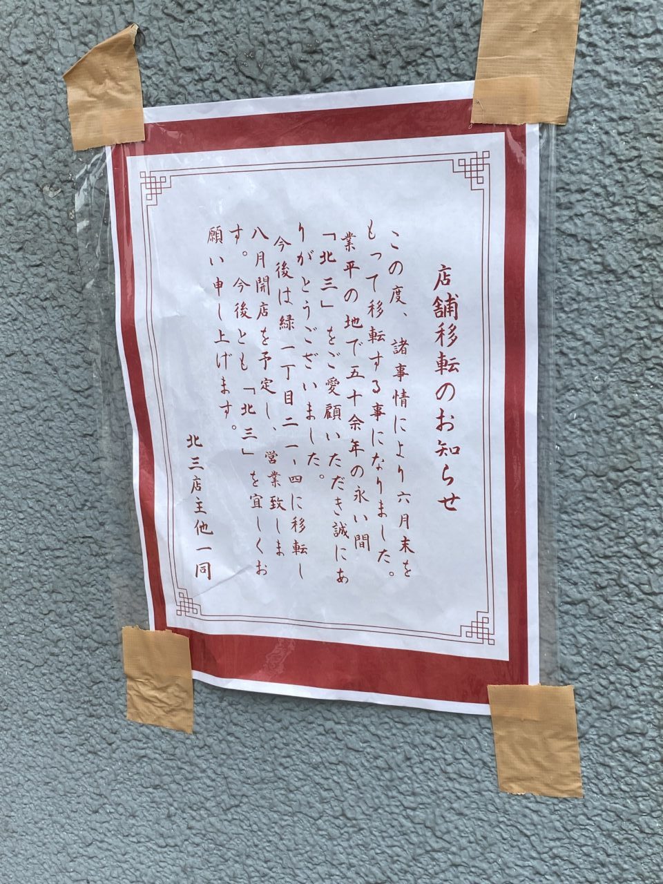 【墨田区】業平の地で51年間営業。「和風ラーメン北三」が6月末をもって業平での営業を終了。