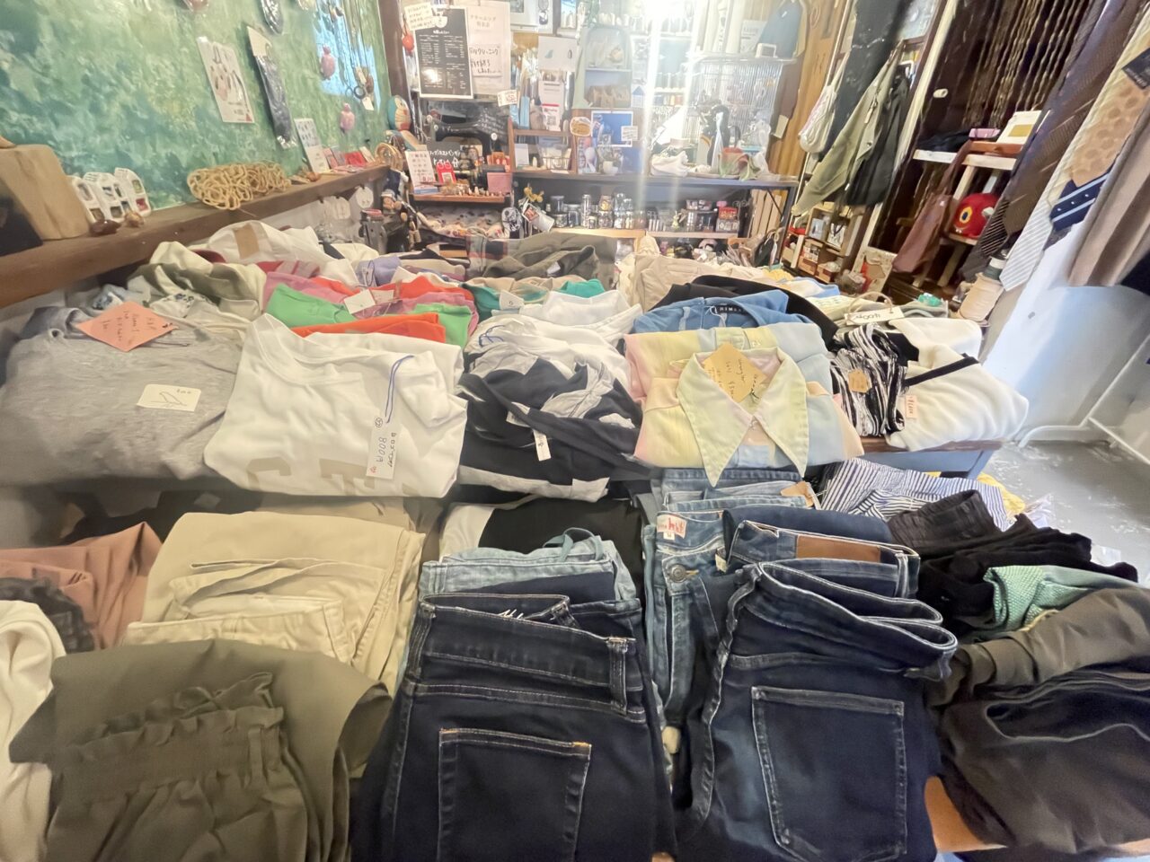 中央のテーブルには、Tシャツやパンツが並べられています。