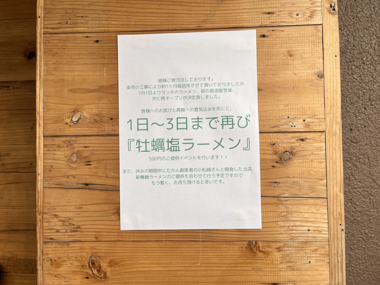 2025年6月25日にはXにて告知があり、7月1日に再開が決定。3日間「牡蠣塩ラーメン」500円イベントを行うそうです。(ランチタイムのみ)