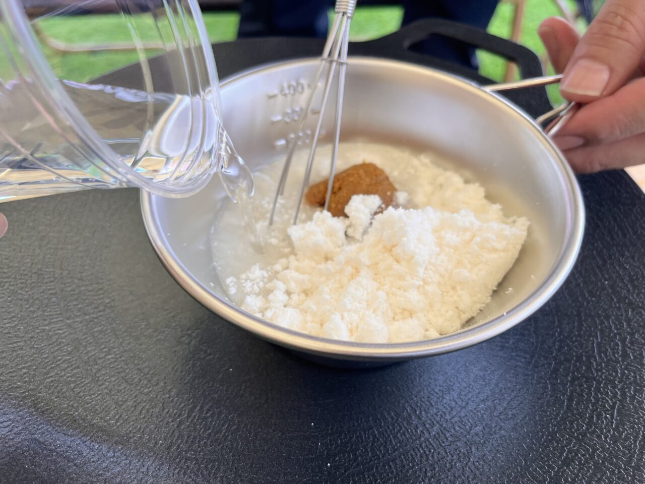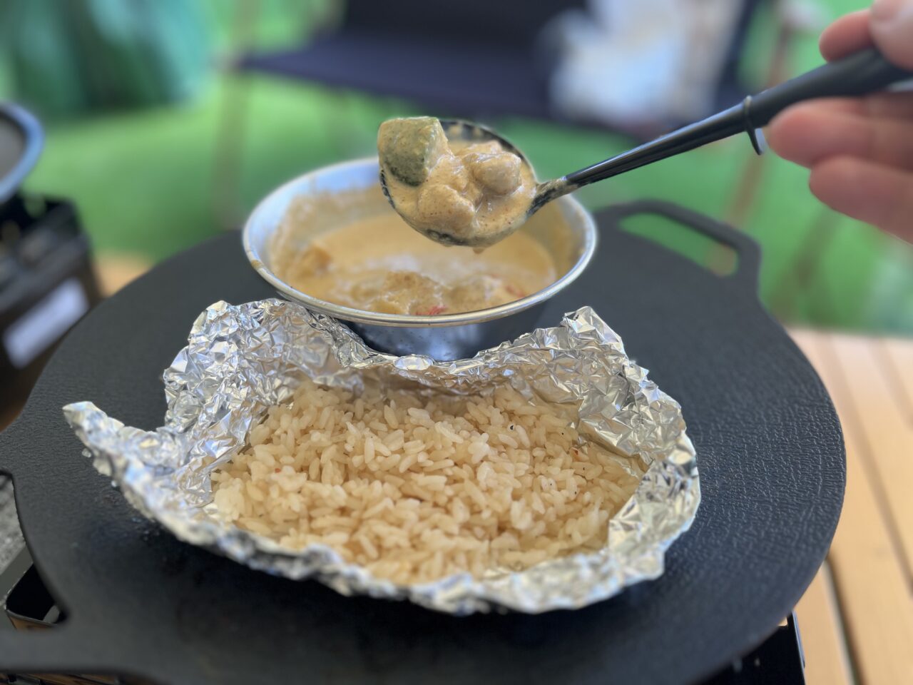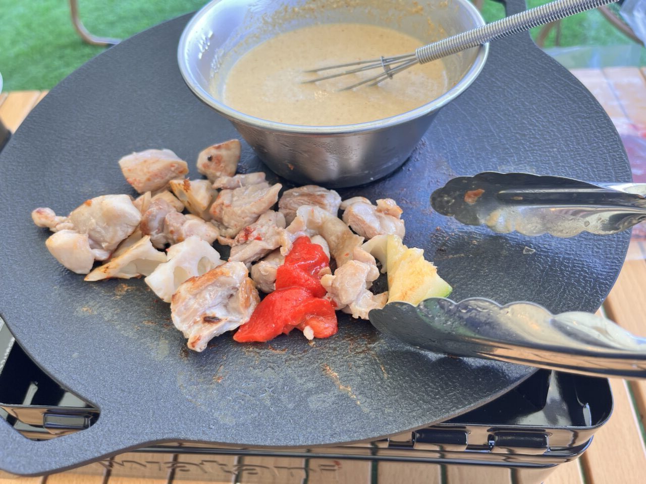 ペーストとココナッツミルクパウダーを水で溶いて加熱しながら、空いているスペースで鶏肉や野菜をグリルしています。