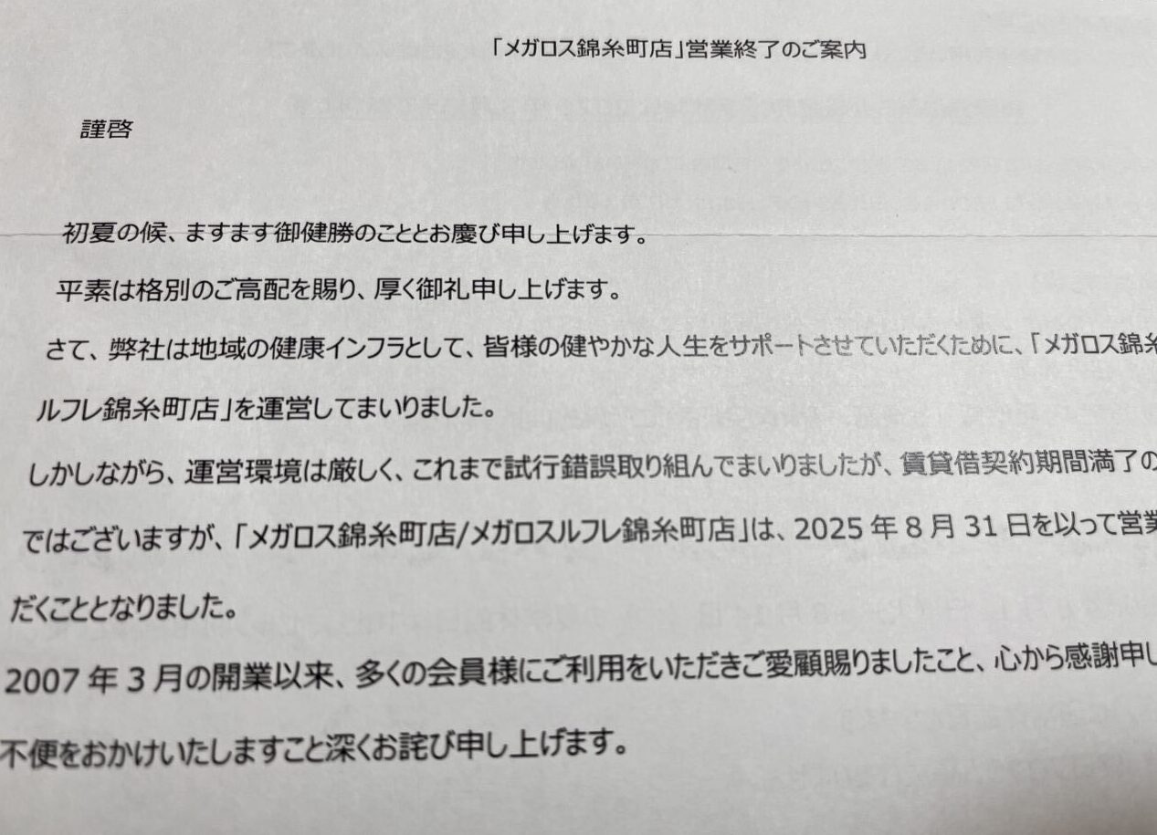「メガロス錦糸町店/メガロスルフレ錦糸町店」は2025年8月31日をもって営業終了させていただくこととなりました。とのお手紙やメールが会員あてに送られて来ました。