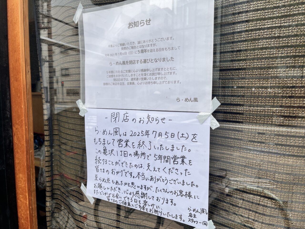 【墨田区】亀沢の「ら・めん風」が7月5日(土)をもって閉店しました。