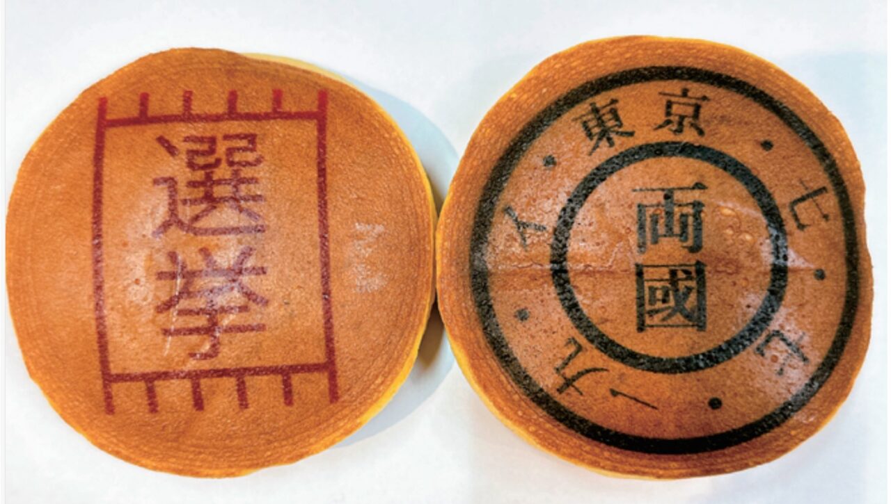 かつて錦糸町の地域で使用された二重丸日付印と選挙郵便に押捺される選挙機械印をプリントしたどら焼きを販売。