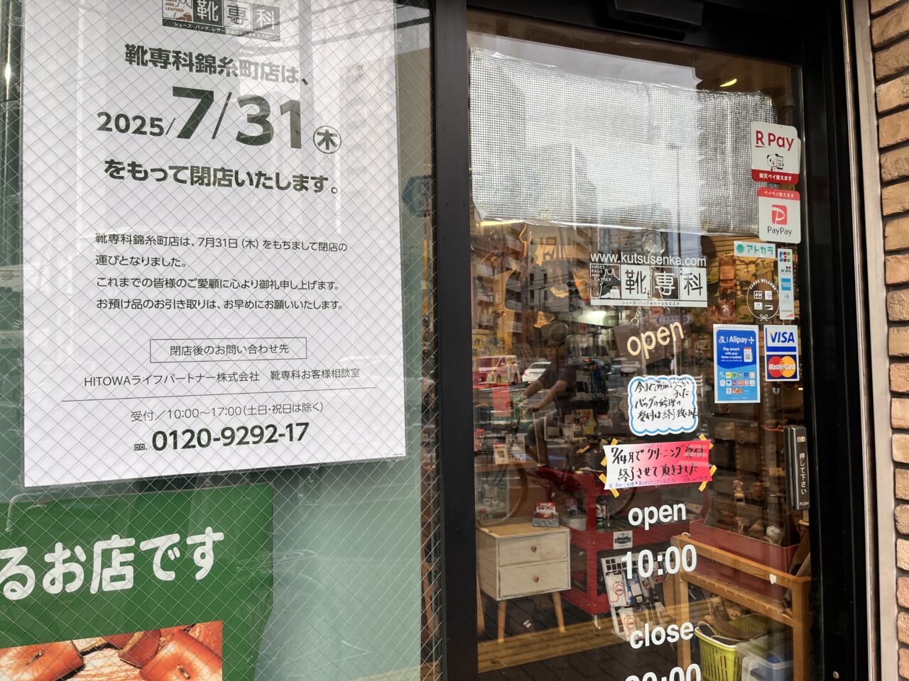 情報をお寄せいただいていましたとおり、店頭には「今までありがとうございました。バッグの修理の受付は終了致しました」との掲示がありました。