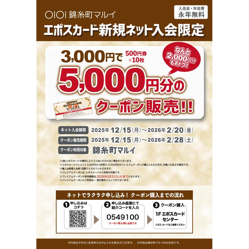 【墨田区】2,000円分おトク!エポスカード新規入会の方、3,000円で5,000円分のクーポン販売【錦糸町マルイ】