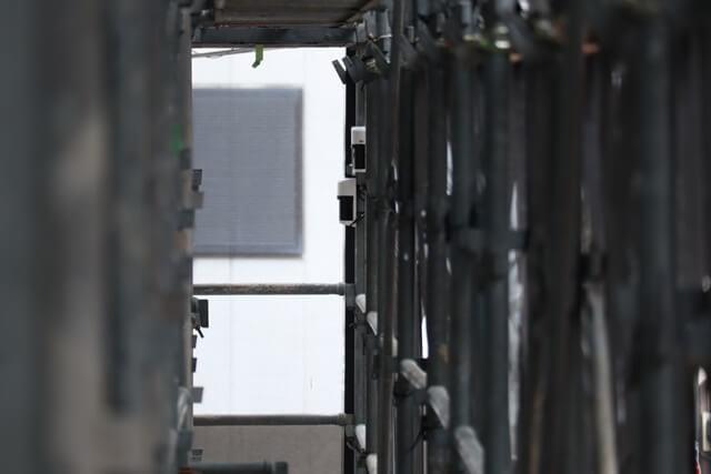 足場には赤外線センサーを設置。夜間工事を行わない間の安全を守ります。防犯カメラ設置・・・そんな注意書きが増えましたが、防犯カメラがあっても増えた近年の闇バイトによる住居侵入事件。夜間、マスクをつけられたら防犯カメラでは心配です。赤外線センサーであれば悪意のある侵入者が、気づかない間に通報ができます。また、弊社では工事に関わるスタッフの服装やマークを統一する事で、工事業者を装ったスタッフの侵入にも気を付けてます。